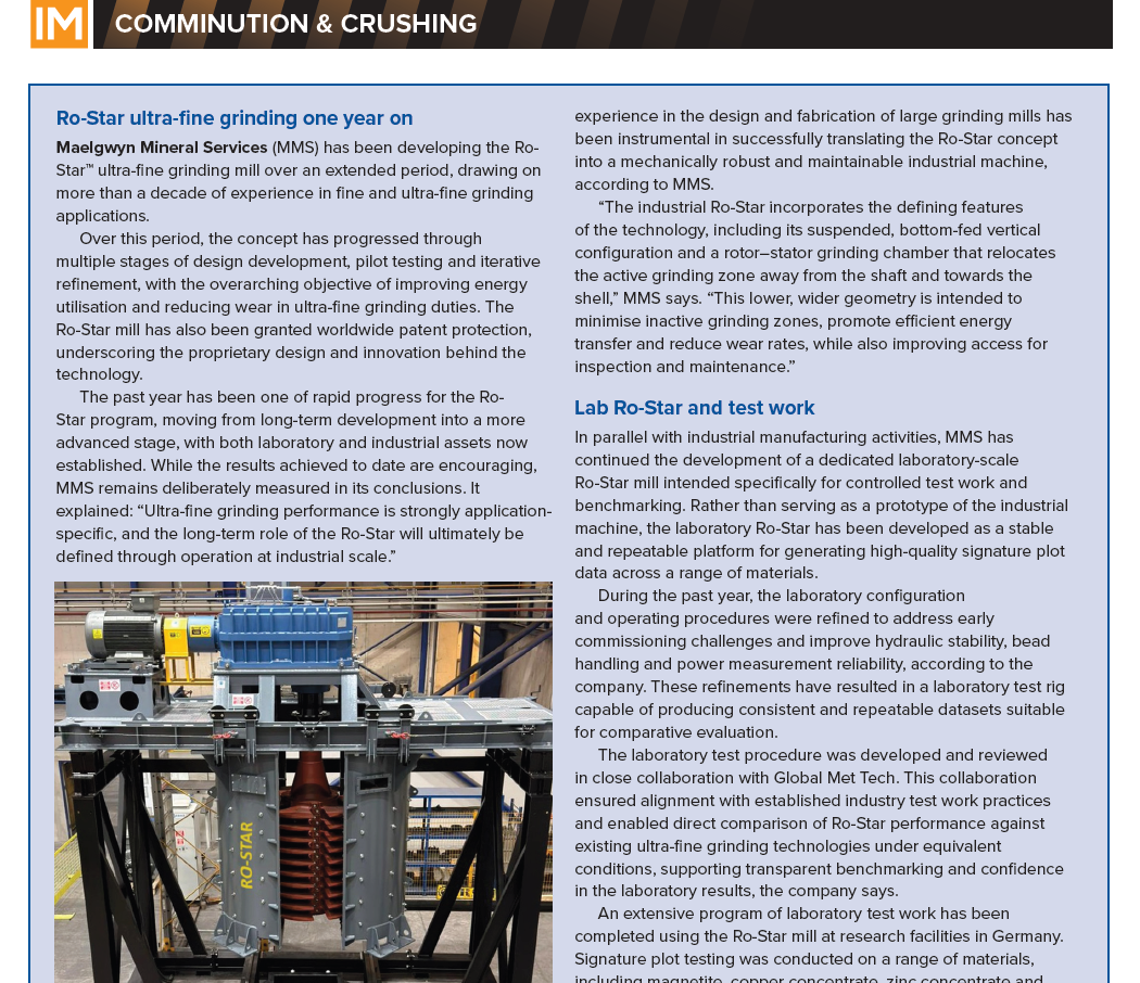 The technology is intended for integration into modern comminution circuits where ultra-fine product sizes, energy efficiency, and wear performance are critical. Ongoing industrial placement and operation will continue to define operating envelopes and support broader commercial deployment of the Ro-Star™ mill family.